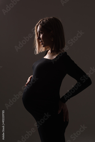 Stylish beautiful pregnant woman in a black dress holds her hands on her stomach.