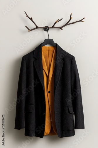 Stylish Black Coat and Warm Orange Sweater Hanging on Modern Branch Hanger Against Neutral Wall Background