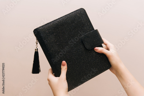 Stylish black notebook with a brush and a button in the hands of the girl. Free space for logo