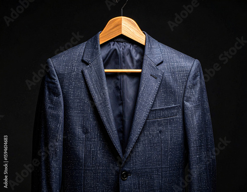blazer, jacket, suit, formal, clothing, fashion, style, men's fashion, apparel, hanger, wooden, blue, textile, fabric, elegant, luxury, design, professional, clothes rack, outfit, menswear, classic, modern, trend, stylish, gentleman, business, interview, meeting, occasion, attire, dark, background, closeup, single, buttons, pocket, collar, sleeve, tailored, garment, indoor, studio, presentation, display, retail