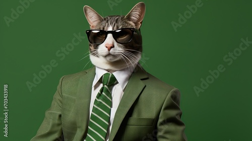 stylish, cat, sunglasses, suit, attaching, isolated, green background, fashionable, felino, cool, trendy, chic, dapper, posh, elegant, sophisticated, formal, hip, sharp, slick, posh, polished, suave, cute, funny, whisker, paw, tail, goggles, dressed up, animal, pet, mysterious