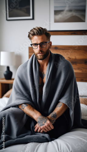 Stylish caucasian man with tattoos wrapped in a cozy blanket sits on a bed, evoking themes of comfort, masculinity, and leisure at home