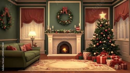 Stylish christmas living room interior with green sofa, white chimney, christmas tree and wreath, stars, gifts and decoration. Family time. Template.