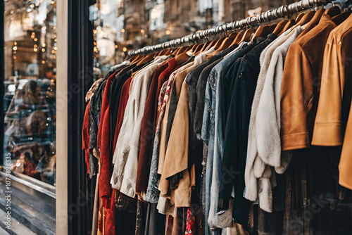 Stylish Clothing Display in a Boutique Window, A boutique clothing rack showcasing elegant coats, jackets, and fashion items in a modern store window