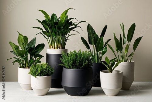 Stylish Collection of Lush Green Plants in Modern Ceramic Pots on Neutral Background