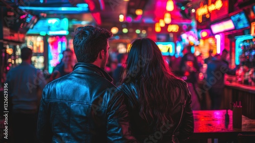 couple, stylish, black, leather, jacket, nightlife, neon, light, bar, urban, romance, together, fashionable, young, love, evening, trendy, vibrant, entertainment, standing, casual attire, joy, connection, scene, fun, city, friends, social, celebration, atmosphere, mood, portrait, cinematography, image, background, aesthetic, modern, playful, warmth, intimacy, charme, youth