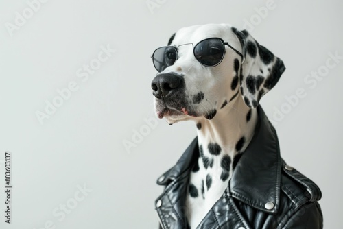 dalmatian, dog, leather, jacket, sunglasses, posing, white background, fashionable, canino, model, pet, animal, chic, cool, cute, adorable, portrait, breed, urban, modern, fashion, runway, designer, hip, trendy, outfit, garment, accessory, attractive, lifestyle, stylish, elegance