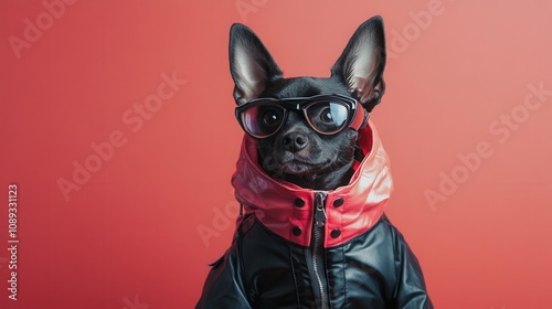 dog, glasses, jacket, stylish, wear, red, animal, pet, sunglasses, style, clothes rack, photo, culture, owner, urban, attire, outfit, statement, playful, set, portrait, design