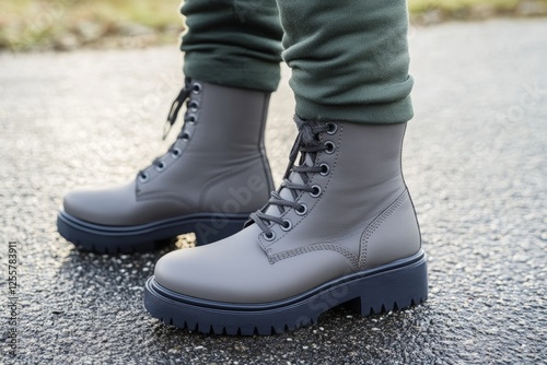 combat, boot, grey, footwear, fashion, pavement, style, detail, trend, person, standing, casual attire, wear, environment, nature, summer, urban, dress, trendy, rugged, practical, comfortable, walking