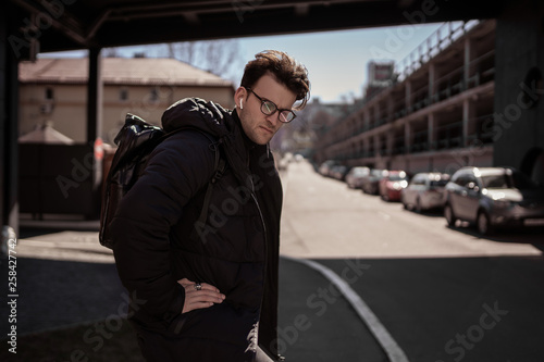 Stylish handsome man in glasses and headphones posing on the street. Wearing a black jacket and backpack.