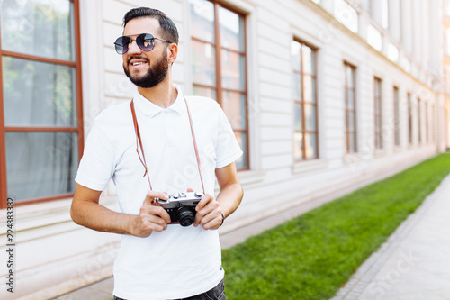 Stylish hipster with a beard and a camera, walking around the city with a camera