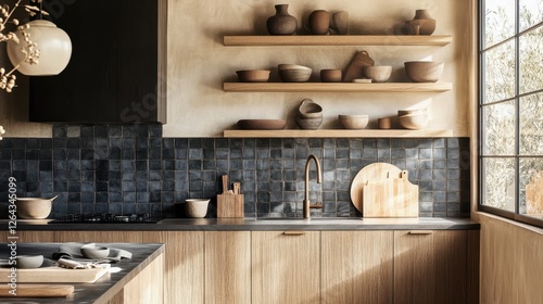kitchen, interior, design, wood, pottery, bowl, shelf, countertop, tile, sink, faucet, decor, light, window, cabinet, modern, contemporary, home, appliance, ceramic, rustic, black, wooden, decoration, dining, cookery, vessel, equipment, cooking, indoor, counter, shelf, tableware, earthenware, furniture, domestic, still, life, inside, nobody, style, clean, surface, empty, utensil, simple, aesthetic, plant