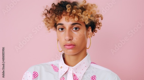 mixed, skin, stylish, woman, closeup, portrait, camera, diverse, trendy, clothes, posing, light, beige, pink, background, studio, chic, elegant, glamourous, confident, beauty, make-up, accessory, fashionable, contemporary, expressive, unique, modern, individuality, charisma, alluring, radiant, captivating, sophisticated, vogue, glamourous, edgy, charismatic, diversity, ethnicity, cosmopolitan, graceful, female, girl, authentic