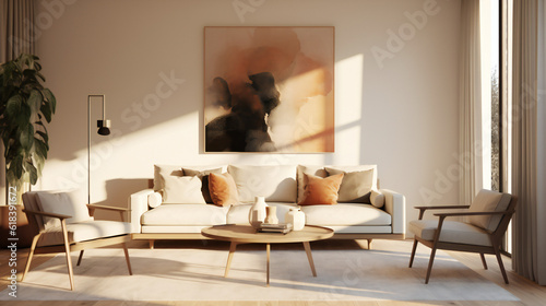 Stylish Living Room Interior with an Abstract Frame Poster, Modern Interior Design, 3D Render, 3D Illustration