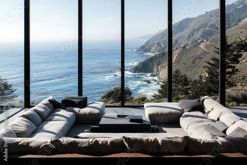 Stylish living room with panoramic ocean view, large windows, and cozy couches, ideal for relaxation and modern home decor.
