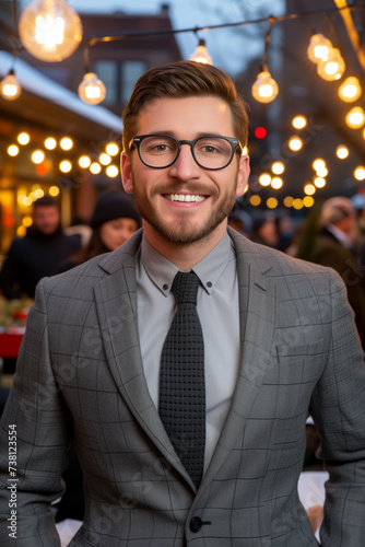 Stylish man in a well-tailored suit stands amidst an ambient setting illuminated by warm lights. The blurred background suggests an evening outdoor event.