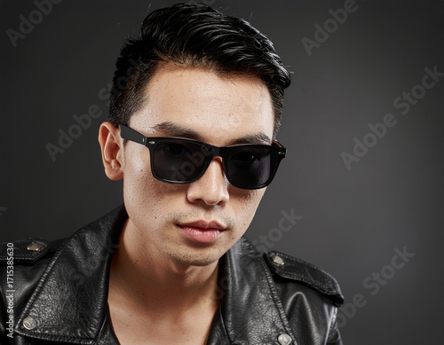 man, sunglasses, leather, jacket, fashion, portrait, individual, powerful, visual, attitude, intense, picture, feeling, human, sophisticated, pose, eye, image, graphic, expression, look, strong, male, serious, person, shade, mood, edgy, contemporary, aesthetic, model, confident, emotion, outfit, face, elegant, menswear, photogenic, studio, hair, motorcycle, stylish, cool, grey