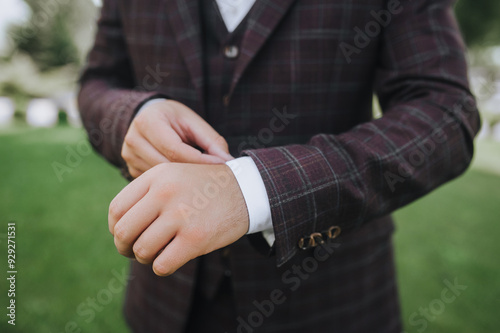 Stylish man in brown checkered suit, young businessman, groom buttoning buttons on jacket with hands in morning. Wedding photography, business, getting ready for work.