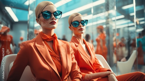 Stylish mannequins behind the glass display window exhibit the latest fashion trends