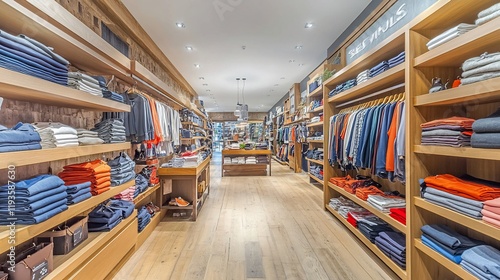 clothing, store, retail, menswear, shelf, wood, apparel, shirt, pant, jean, stack, folded, display, rack, boutique, fashion, style, design, interior, shop, garment, orange, blue, grey, light, bright, wooden, modern, clean, neat, organised, merchandise, casual attire, elegant, sophisticated, market, business, product, consumer, client, shopping