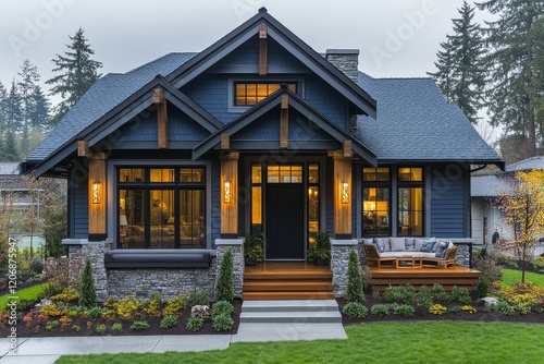 Stylish modern American-style single-family house with wooden porch, grey walls, stone accents, cozy seating area, and green front yard in springtime.