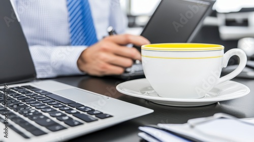 hot drink, cup, laptop, office, workspace, business, beverage, desktop, work, professional, technology, productivity, stationery, tea, writing, sharpened, meeting, casual attire, modern, organisation, design, corporate, concentration, person, hand, paper, table, equipment, cyberspace, communication, relaxation, inspiration, lifestyle, career, management, datum, software, analysis, creativity, planning, study, comfort, energy, arrangement, setting, task, efficiency, interaction
