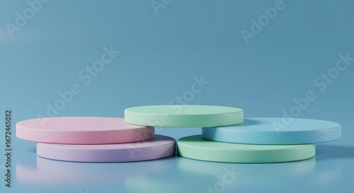 platform, cylinder, circle, light blue, pink, green, purple, blue, minimalist, modern, abstract, geometric, showcase, presentation, background, studio, empty, clean, elegant, calm, serene, smooth, reflective, overlapping