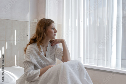 Stylish patient in robe during medical blood sampling, modern clinic interior, wellness theme