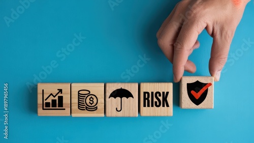 Stylish photo of Risk management and insurance concept with wooden blocks and icons on a blue background.
