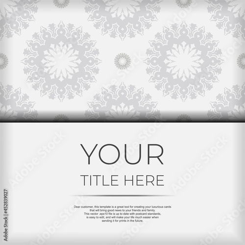 Stylish Ready-to-print white postcard design with luxurious Greek patterns. Invitation card template with vintage ornament.