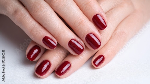 Stylish red manicure nail art close up beauty salon glossy red nails female hand fashion elegant hand model