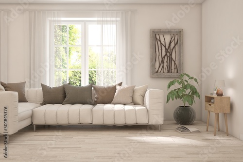 Stylish room in white color with sofa and summer landscape in window. Scandinavian interior design. 3D illustration