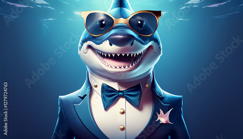 shark, suit, sunglasses, stylish, trendy, character, art, illustration, cool, fashion, aquatic, animal, business, formal, attire, blue, gold, modern, unique, creative, fun, professional, cartoon, vibrant, digital artwork, face, vector