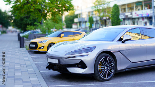 Stylish silver and yellow sports cars parked along a city street on a sunny day