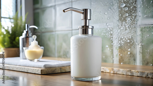 soap, dispenser, stylish, bathroom, countertop, wooden, skincare, product, green, plant, hygiene, cleanliness, modern, interior, design, bottle, cream, decor, foam, freshness, health, beauty, space, minimalist, ambient, home, arrangement, aesthetic, natural, light, contemporary, elegant, convenient, luxury, setting, spray, elegance, liquid, container, essential, functionality, domestic, tranquil