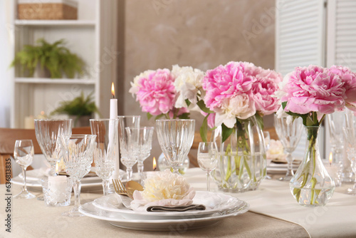 Stylish table setting with beautiful peonies and burning candles indoors