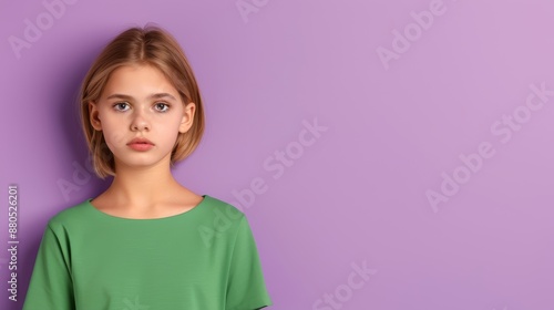 Stylish teen girl in green attire, presenting empty space, set against a purple backdrop, realistic high-res portrait, focus cover all object