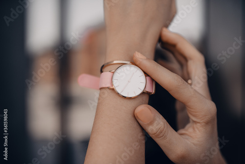 Stylish white watch on woman hand. Close-up photo