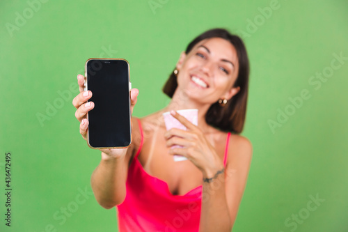 Stylish woman in pink silk dress isolated on green background happy excited point on black empty mobile phone screen
