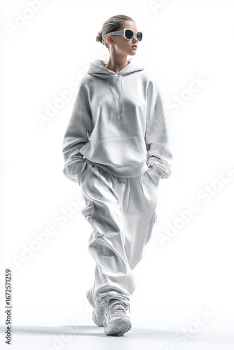 woman, white, outfit, sunglasses, style, vogue, relaxed, youth, simplicity, posh, youthful, social, chic, plain, designer, tone, person, full, contemporary, elegance, looking, aesthetic, indoor, model, body, wear, eyewear, confident, shot, away, popular, elegant, standing, shoe, comfortable, posing, female, new, unisex, studio, portrait, sporty, stylish, cool, footwear, monochrome, collection, young, modern