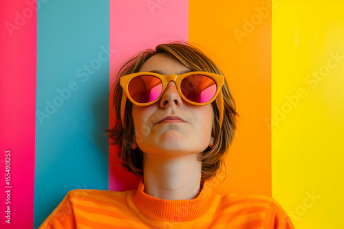 Stylish young woman with orange sunglasses against colorful background, fashionable and trendy look
