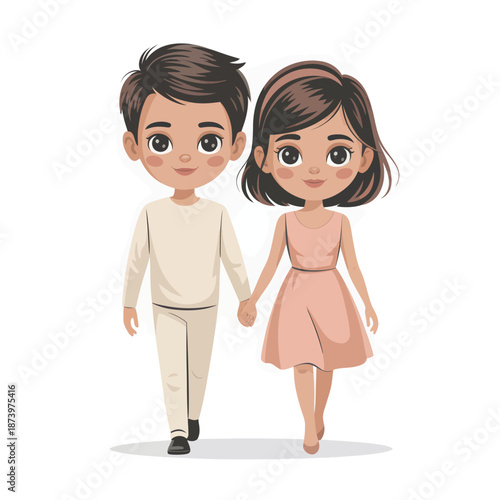 Stylized Boy and Girl Standing Side by Side Holding Hands, Romantic Cartoon Illustration