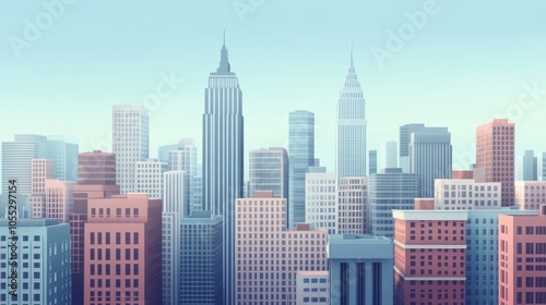 city landscape, city, skyscraper, building, urban, architecture, tall, modern, minimal, pastel, blue, pink, grey, geometric, illustration, digital, art, design, graphic, style, clean, simple, abstract, skyline, horizon, light, bright, high-coloured, smooth, sharp, futuristic, dynamic, contrast, texture, shape, structure