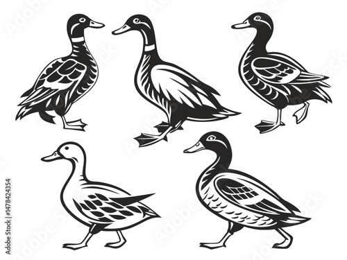 Stylized Duck Vector Set – Black and White Illustrations in Folk and Vintage Style