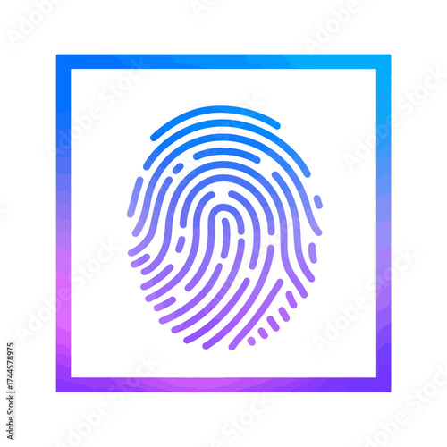 Stylized fingerprint icon in blue and purple gradient within a square frame, concept for security system, personal identification and access control technology