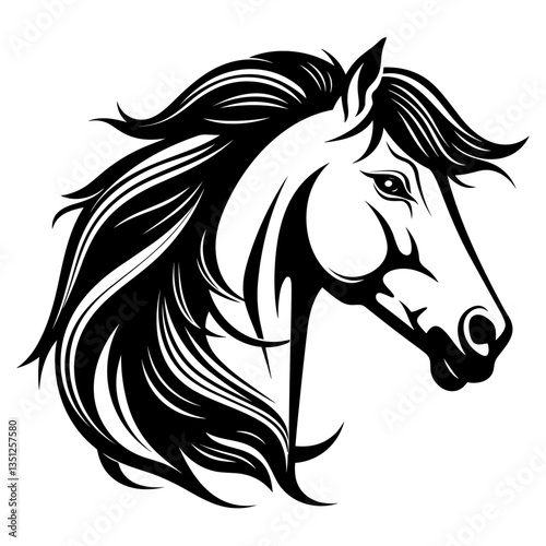 Stylized horse head illustration in black and white, perfect for logos, tattoos, and graphic design projects.