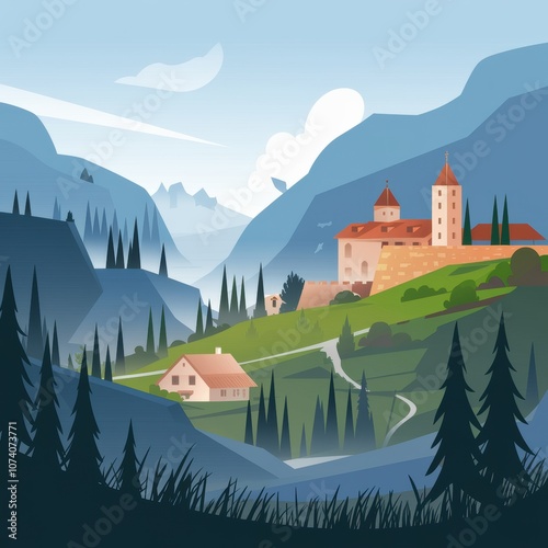 Stylized Landscape: A serene mountain scene featuring a castle, forests, and rolling hills in muted green and blue tones. Ideal for travel themes.