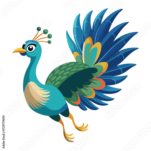 Stylized Peacock Illustration with Vibrant Blue and Green Plumage on White Background