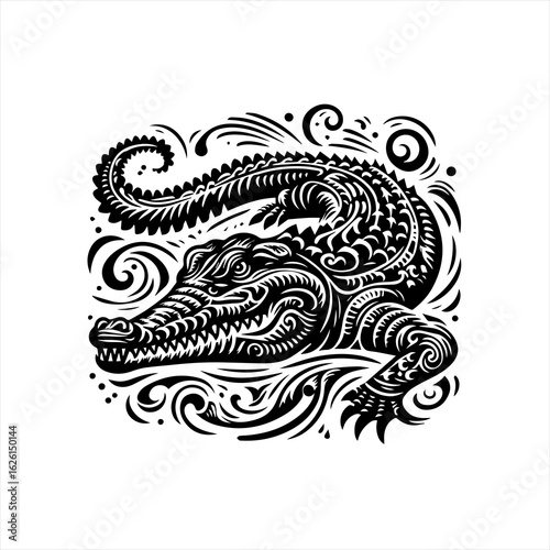 crocodile, alligator, reptile, animal, tribal, stylised, illustration, vector, art, graphic, design, pattern, ornate, decorative, intricate, abstract, black, white, monochrome, ink, drawing, vignetting, tattoo, symbol, emblem