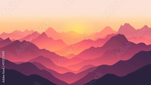 Stylized vector illustration of mountains at sunset, with warm orange and pink tones filling the sky, casting shadows on the landscape.